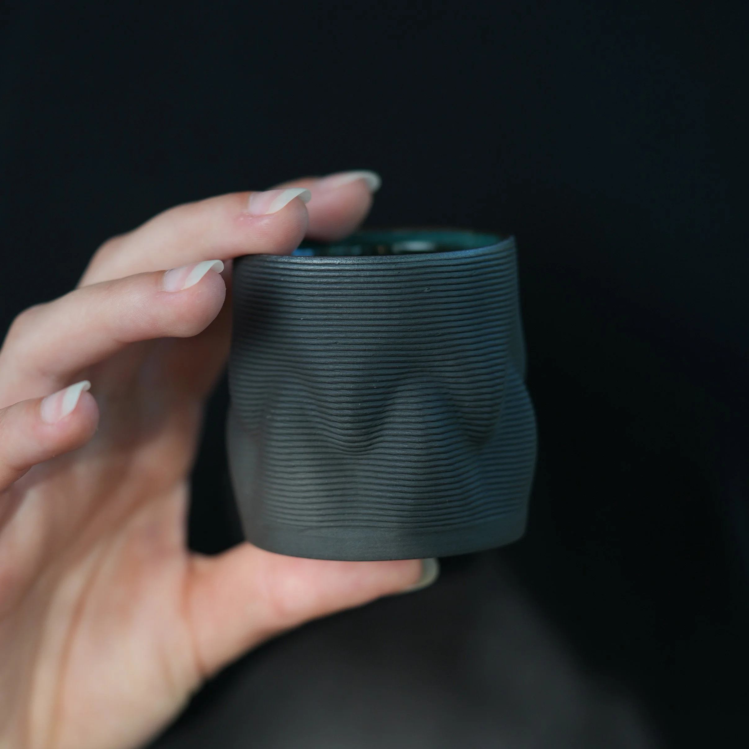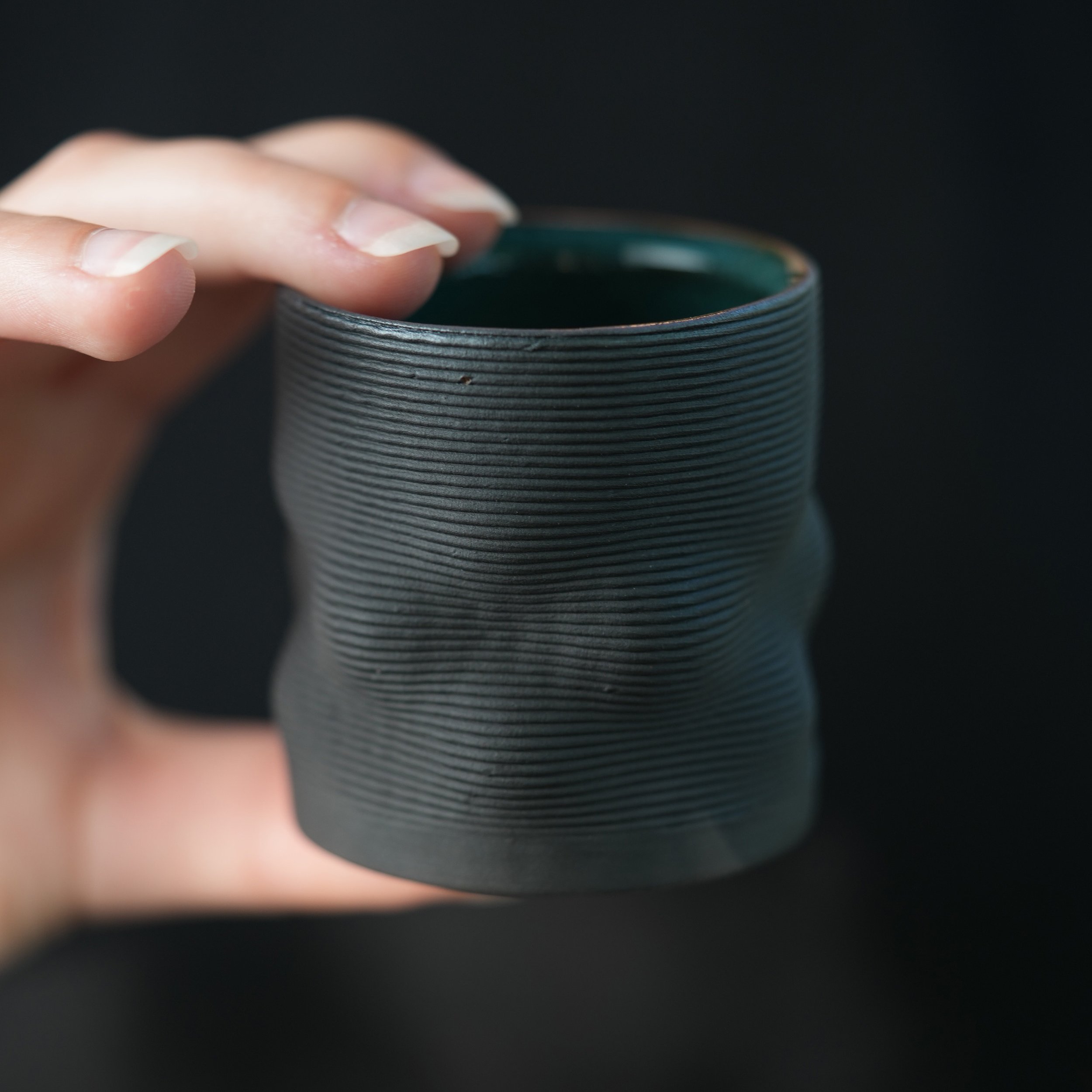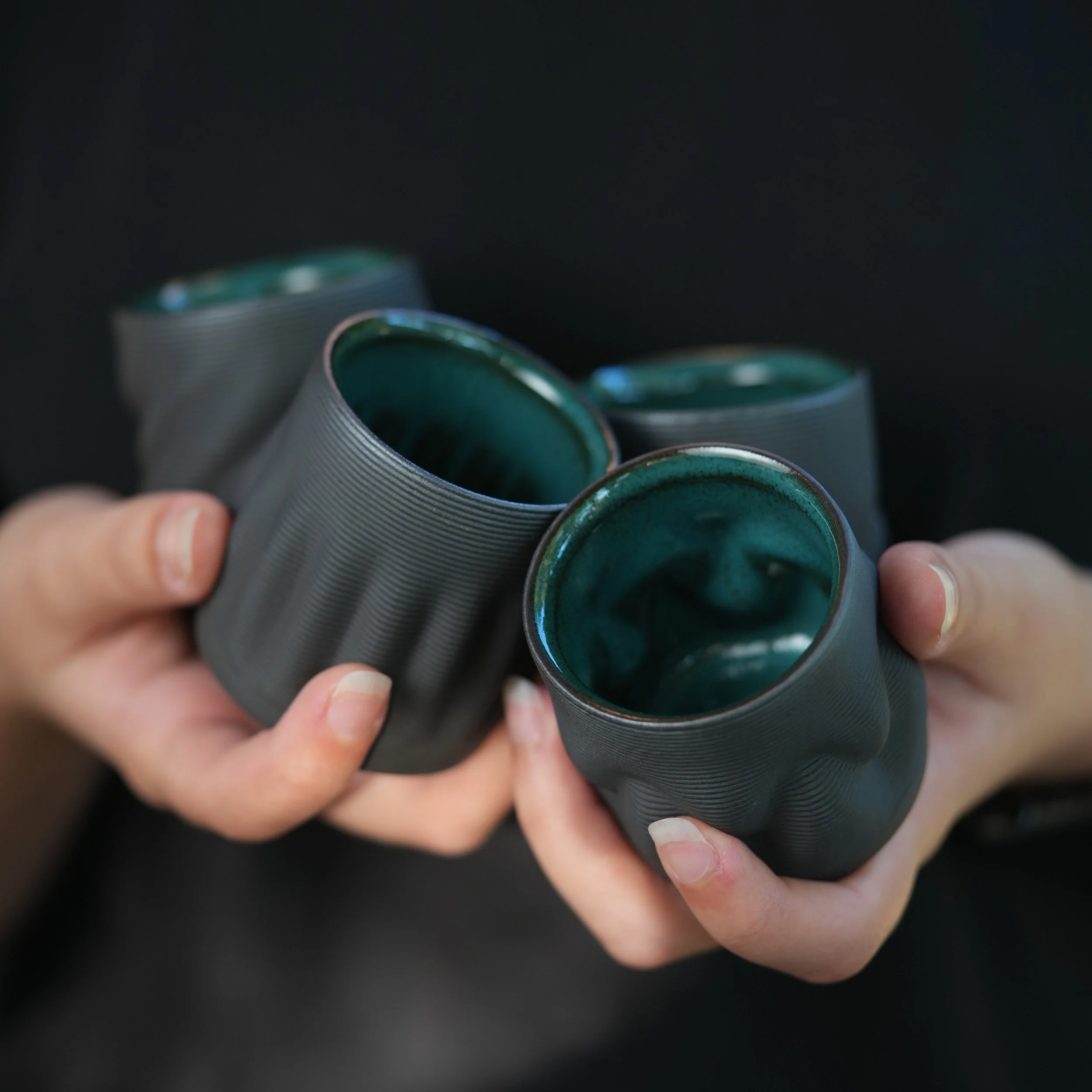 This set of four cups celebrates variation and individuality. Each one is 3D printed in dark clay, with subtle shifts in shape and texture that make them completely unique while still belonging together as a family. The deep green glaze inside contrasts beautifully with the raw dark exterior, creating a striking balance between refinement and raw materiality.