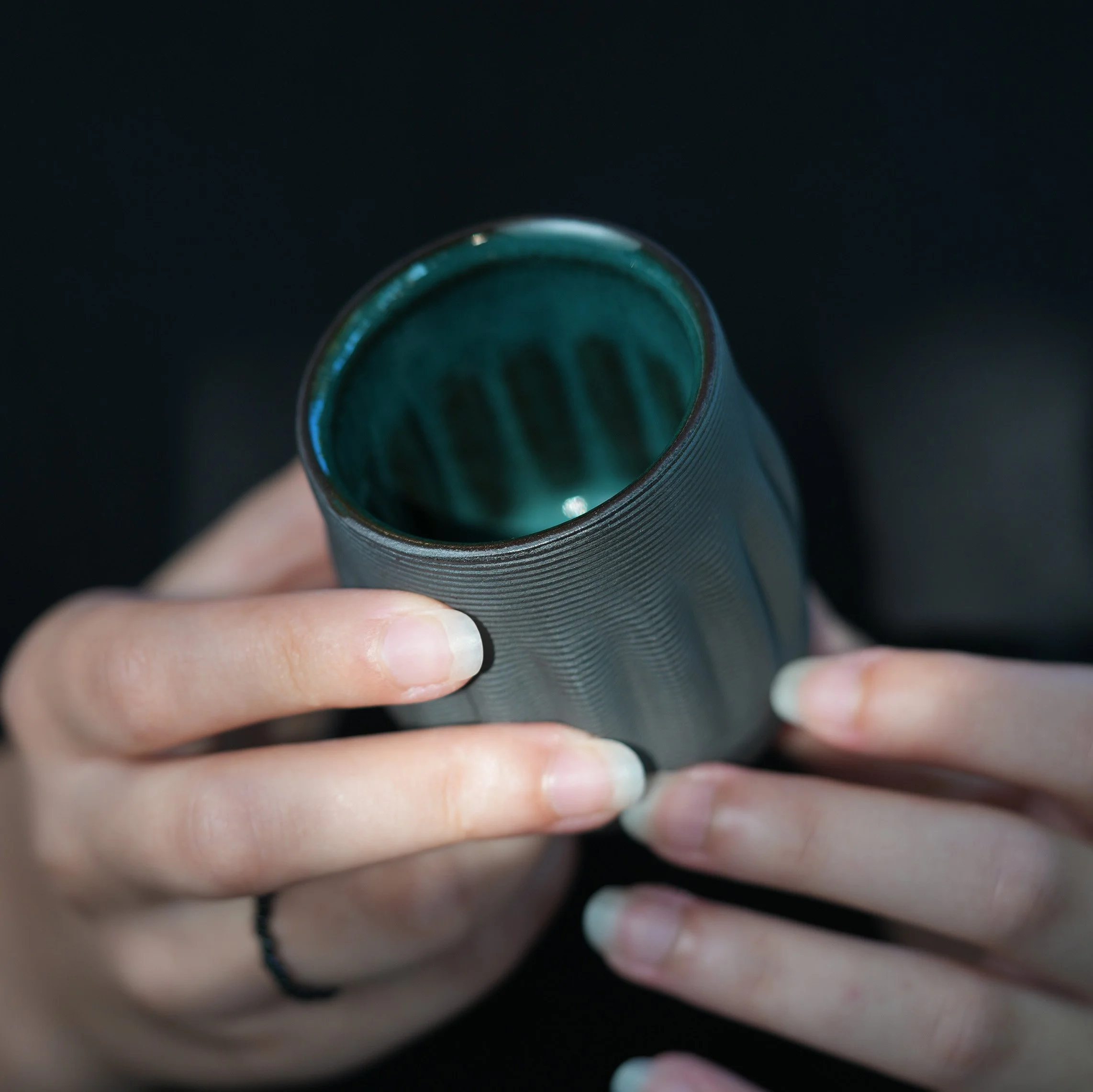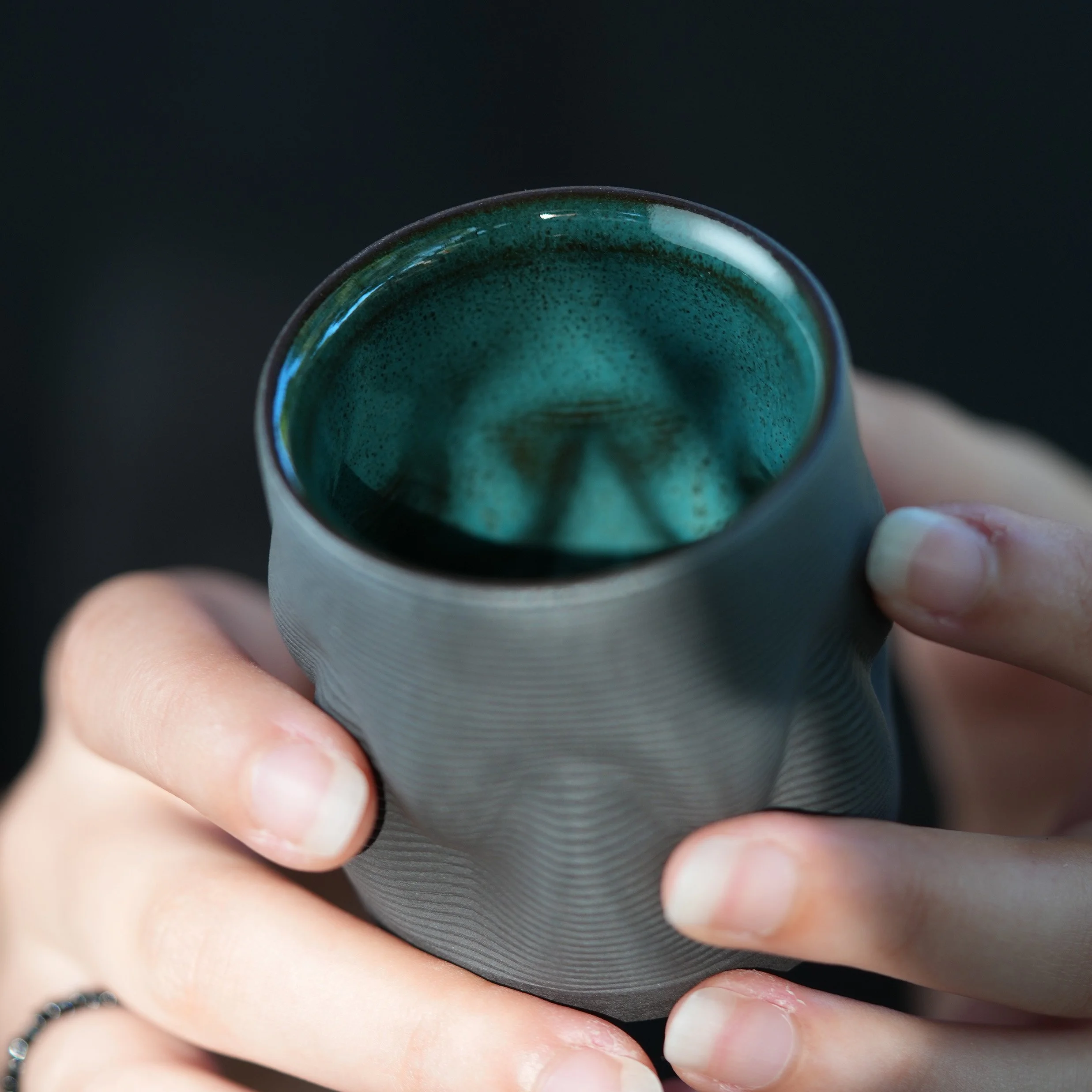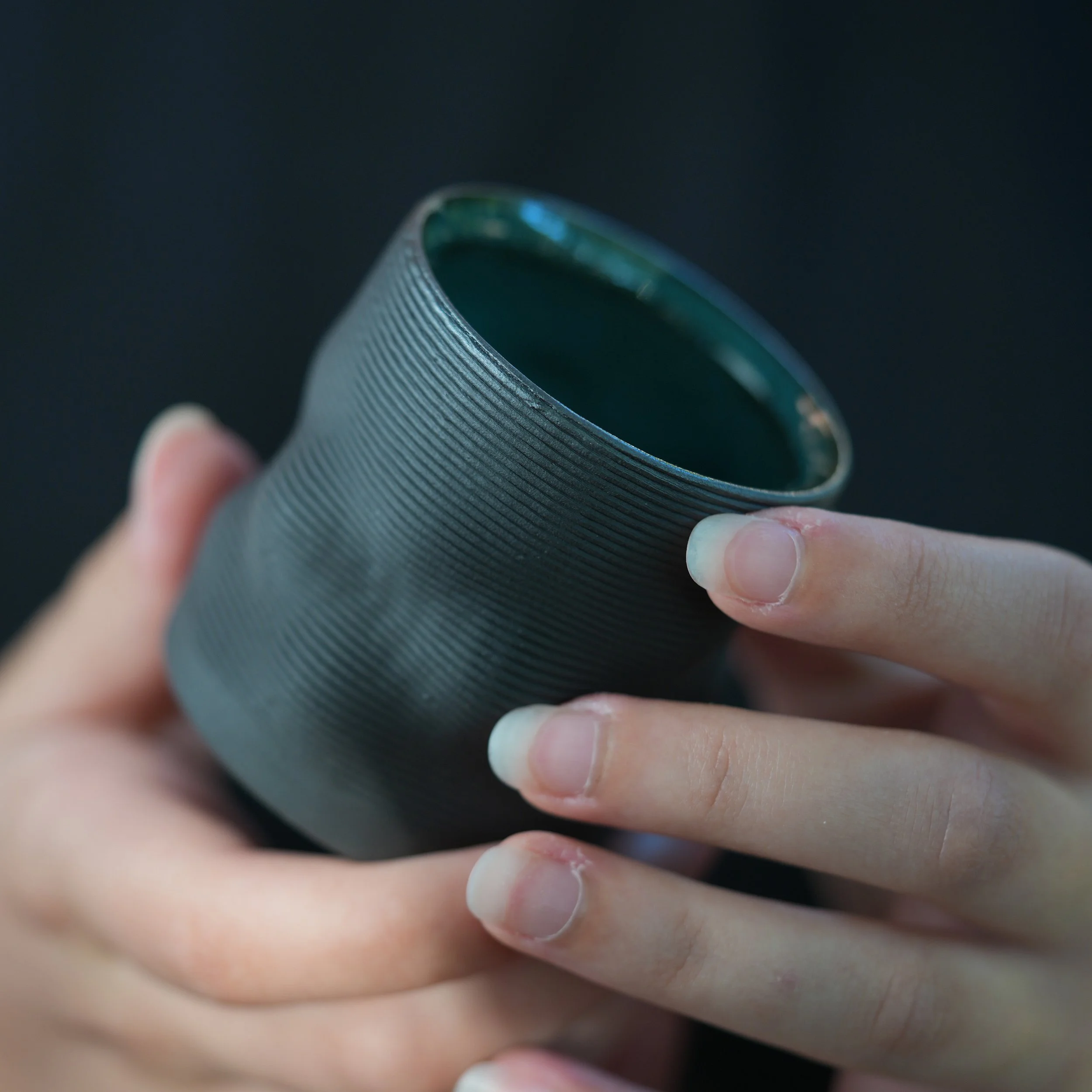 This set of four cups celebrates variation and individuality. Each one is 3D printed in dark clay, with subtle shifts in shape and texture that make them completely unique while still belonging together as a family. The deep green glaze inside contrasts beautifully with the raw dark exterior, creating a striking balance between refinement and raw materiality.