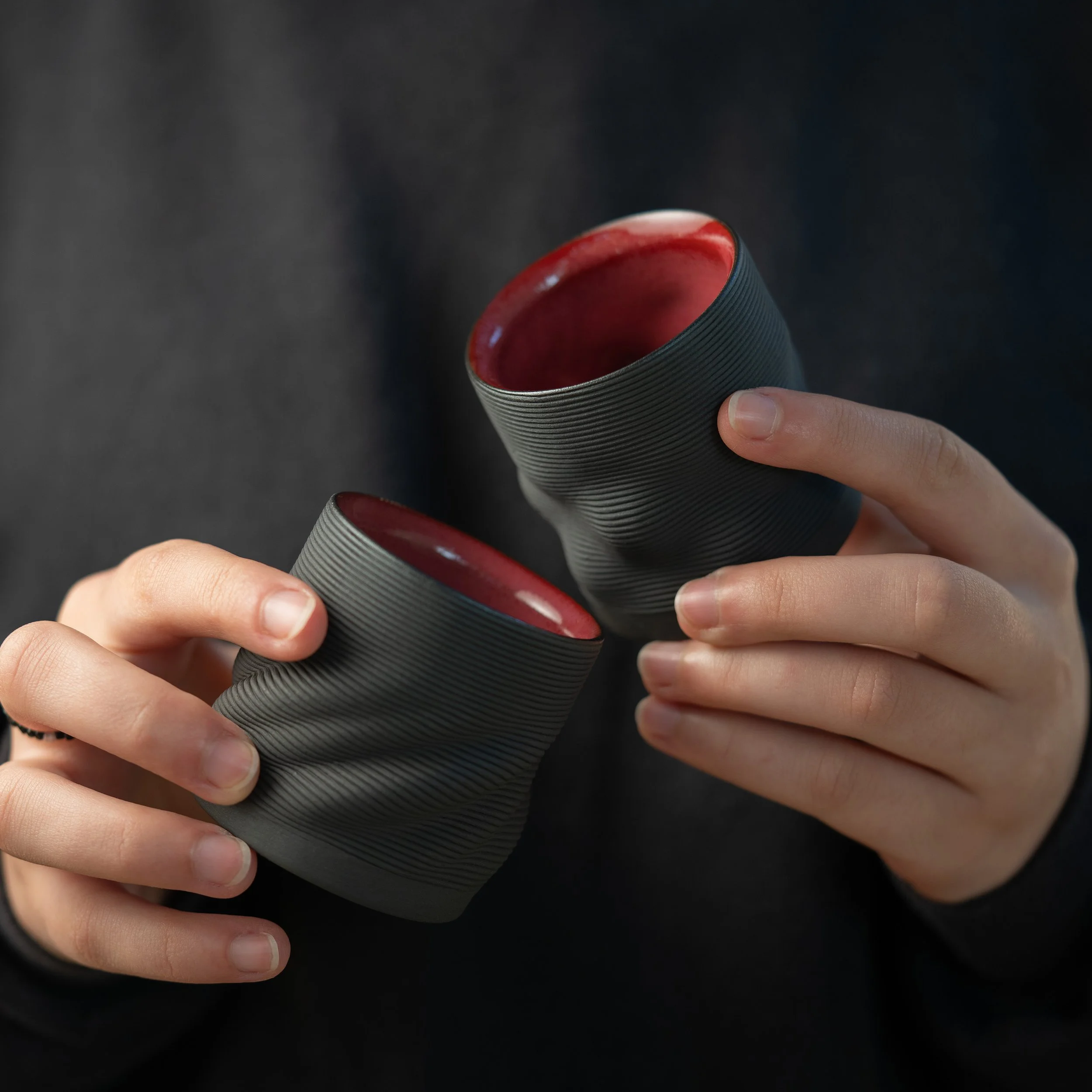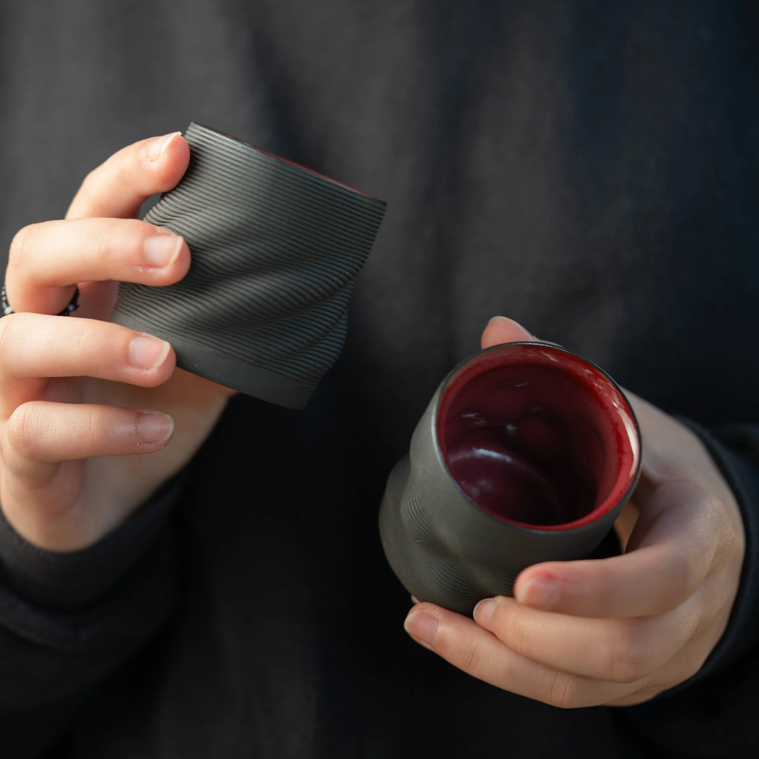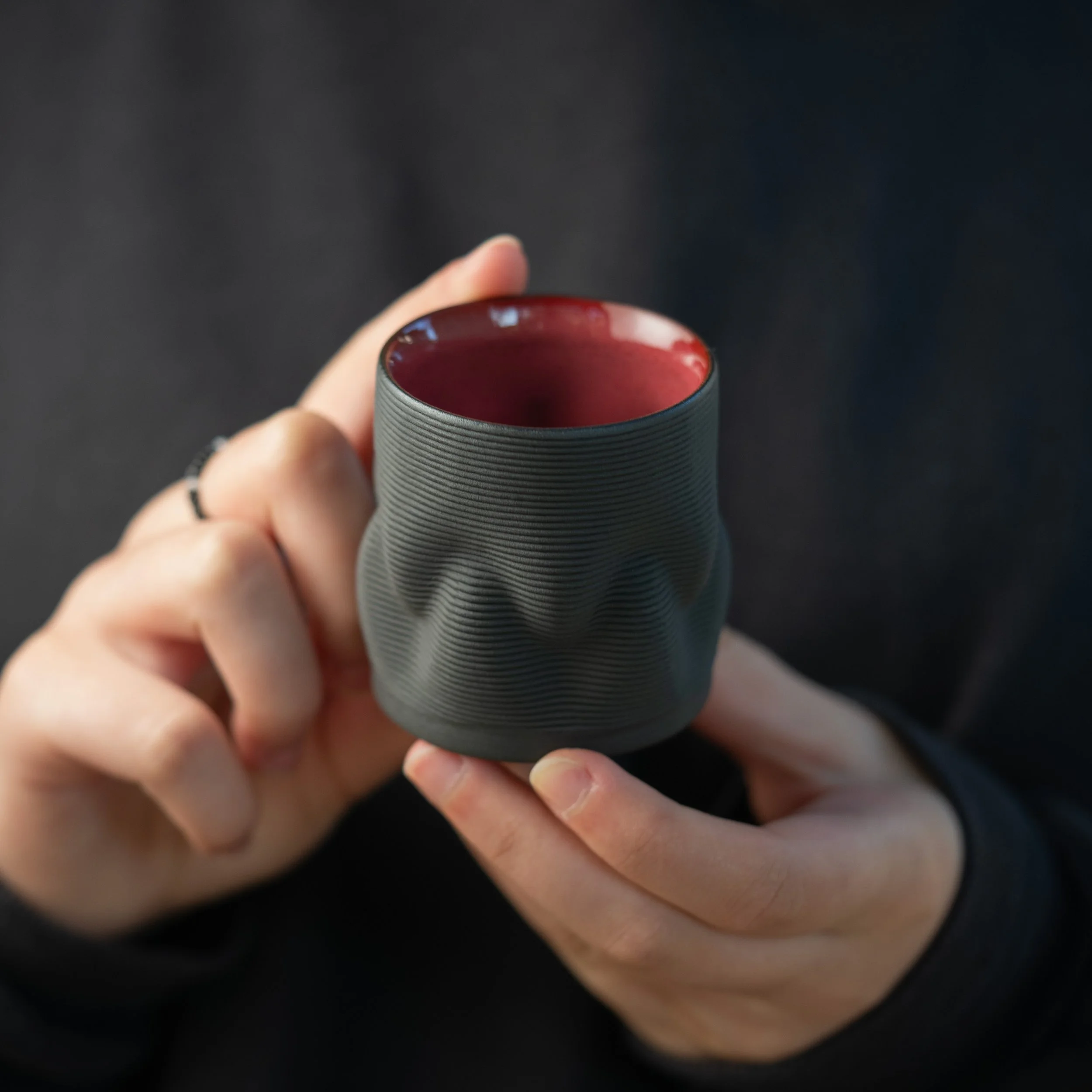 These 250 ml cup was designed to feel alive in the hand. Instead of building it with flat, uniform layers, we used a technique called volumetric and non-planar extrusion—where every line of clay flows in a continuous wave, adapting to the curves of the form as it grows.