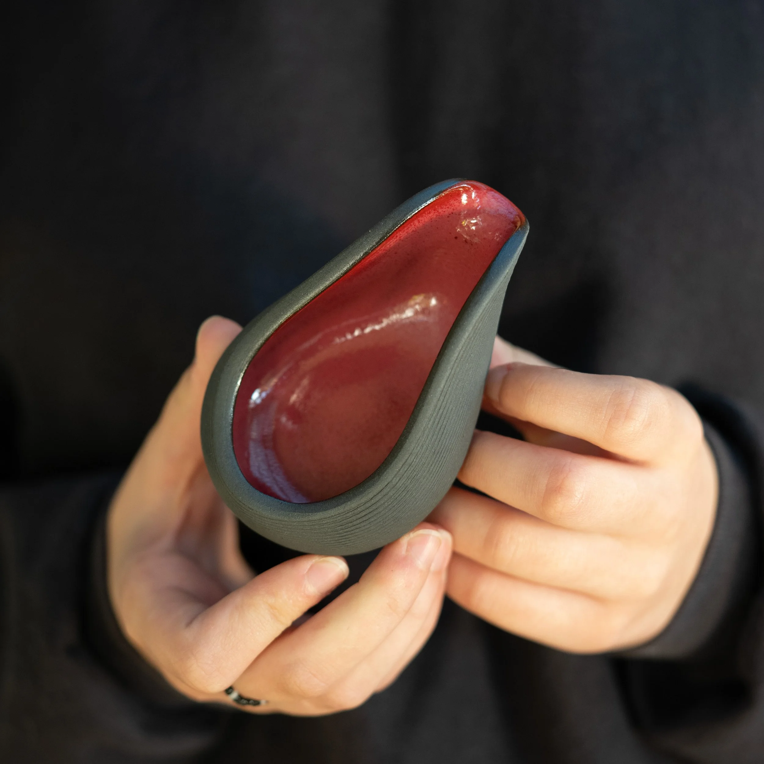 The surface is subtly warped, almost like fabric in motion, giving it a tactile rhythm that reflects the way it was printed. Inside, it’s glazed with food-safe glaze in deep blue that contrast with the matte, cast-iron feel of the outer clay.
